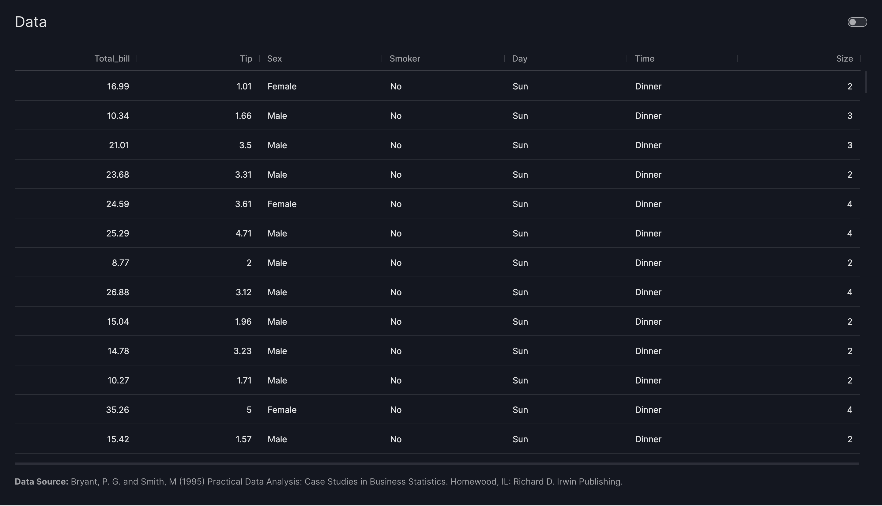 This tutorial uses the tips dataset, which was collected by a waiter who recorded information about each tip he received over several months at a restaurant.