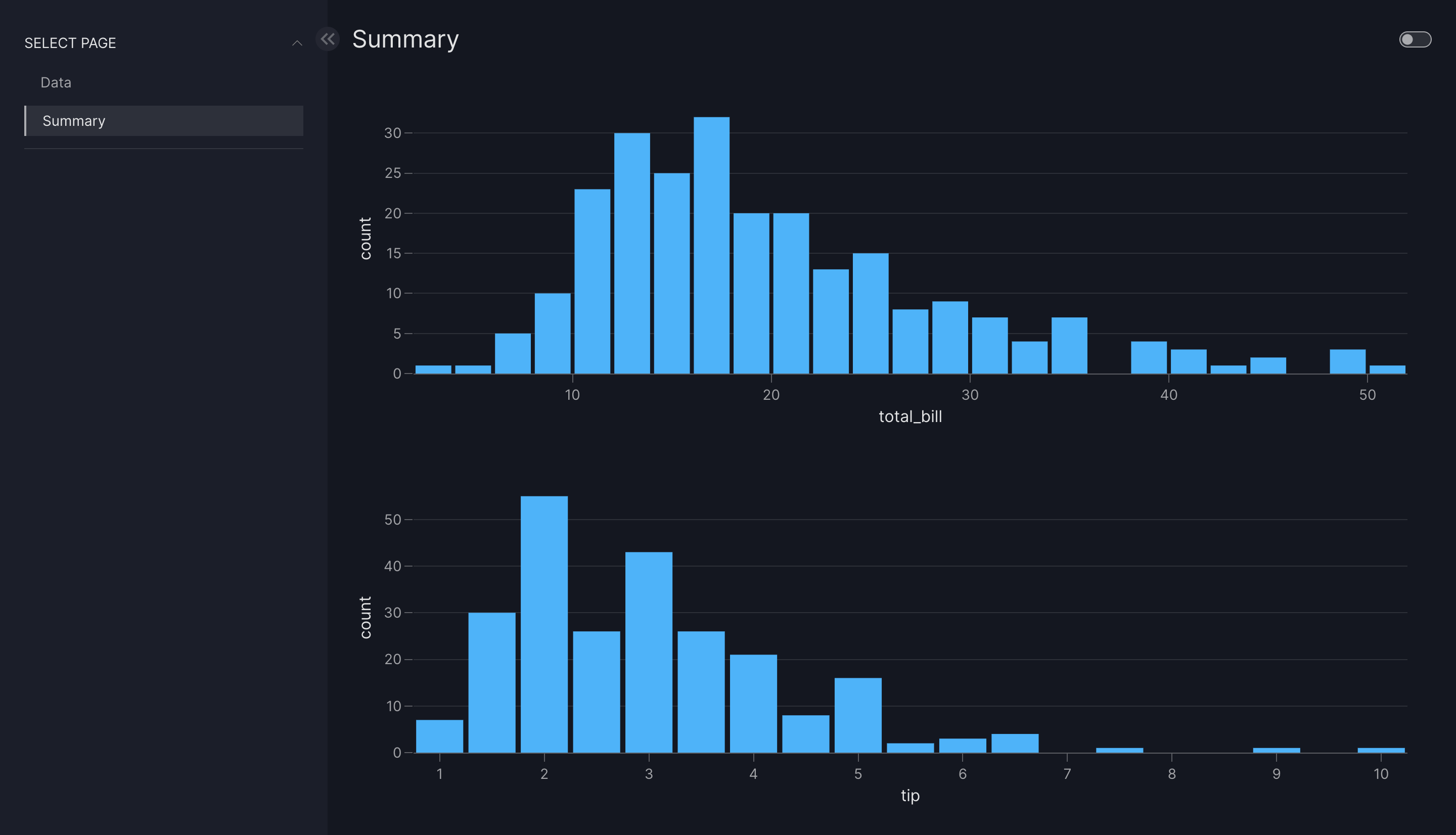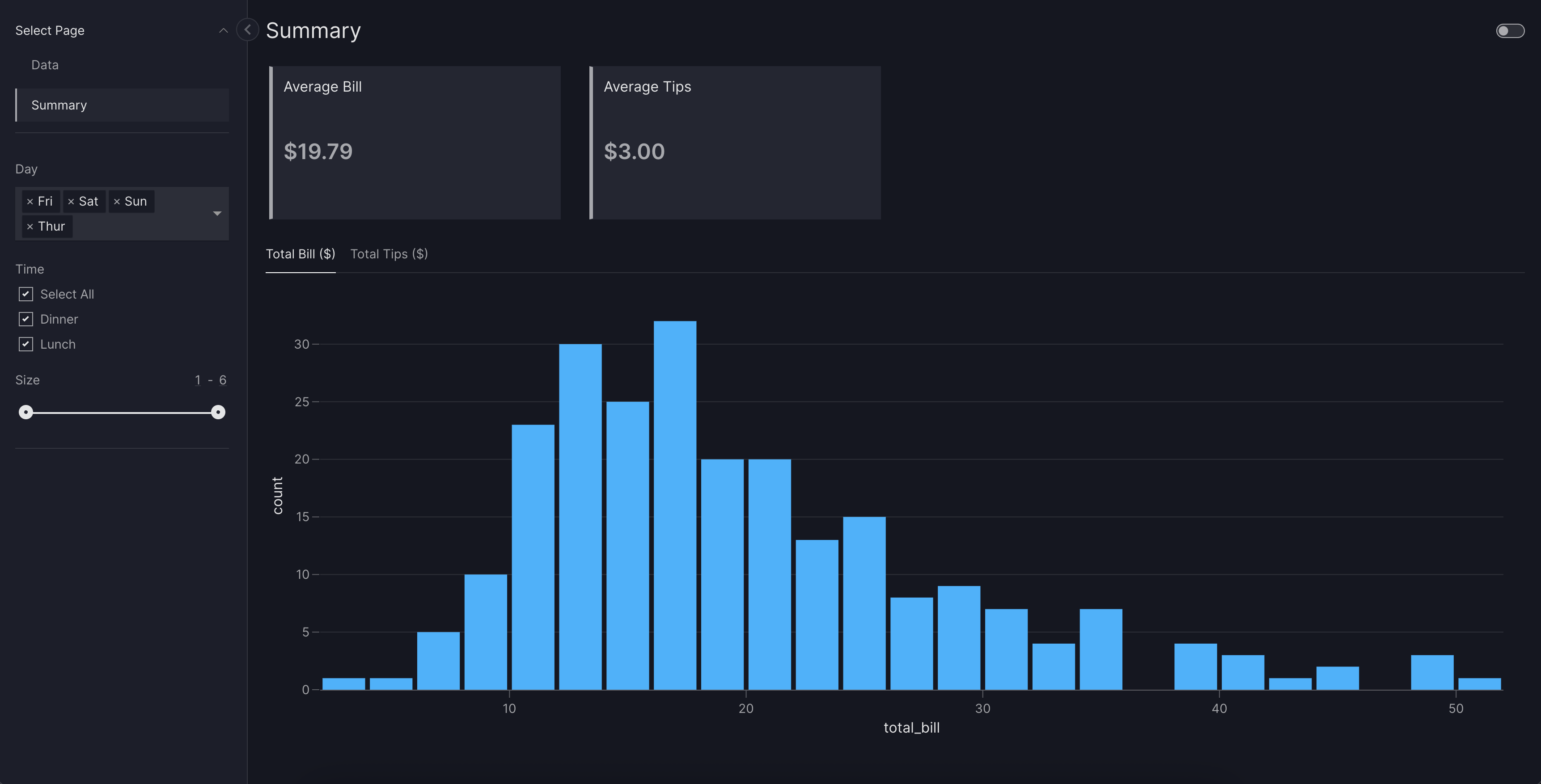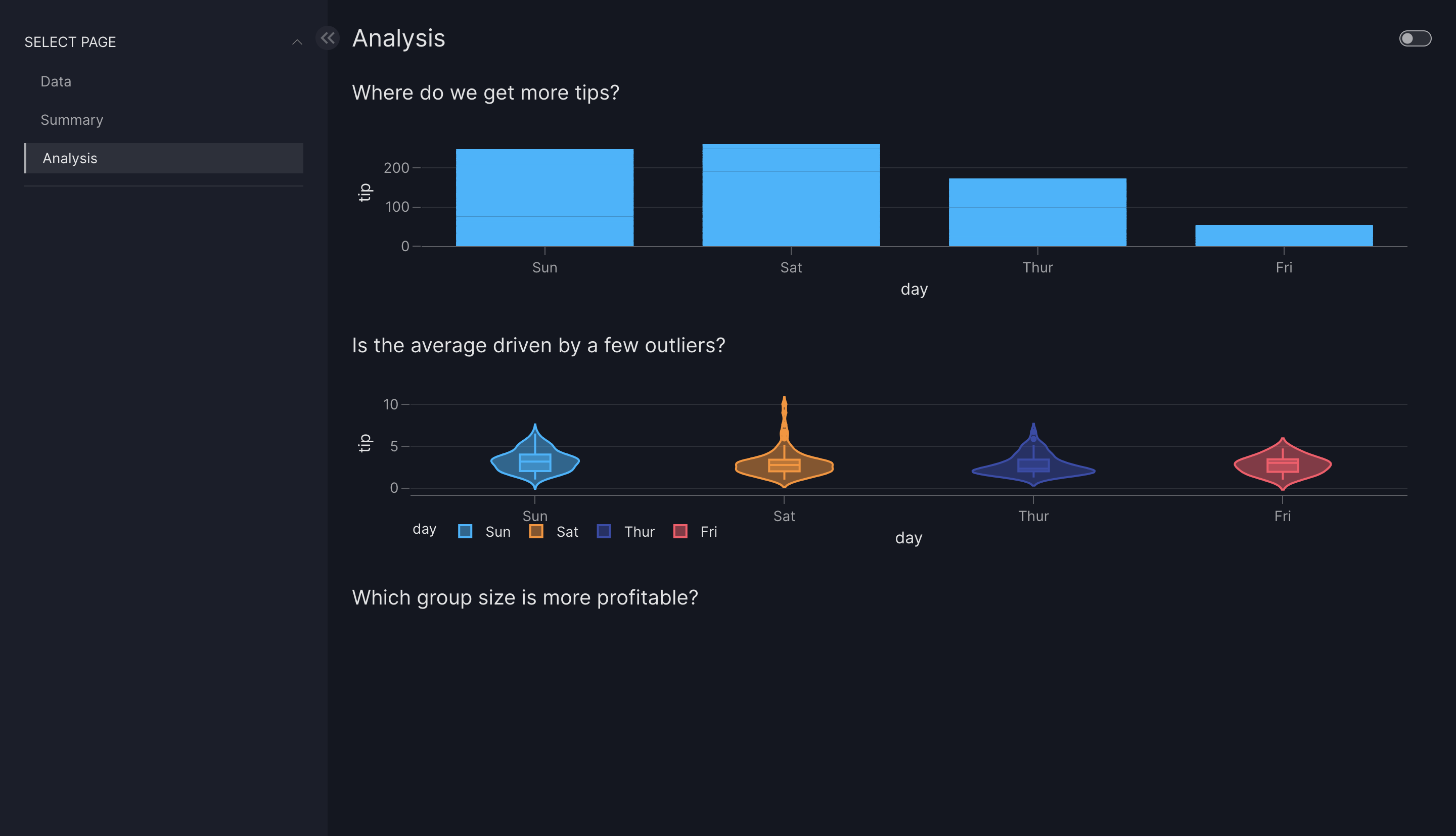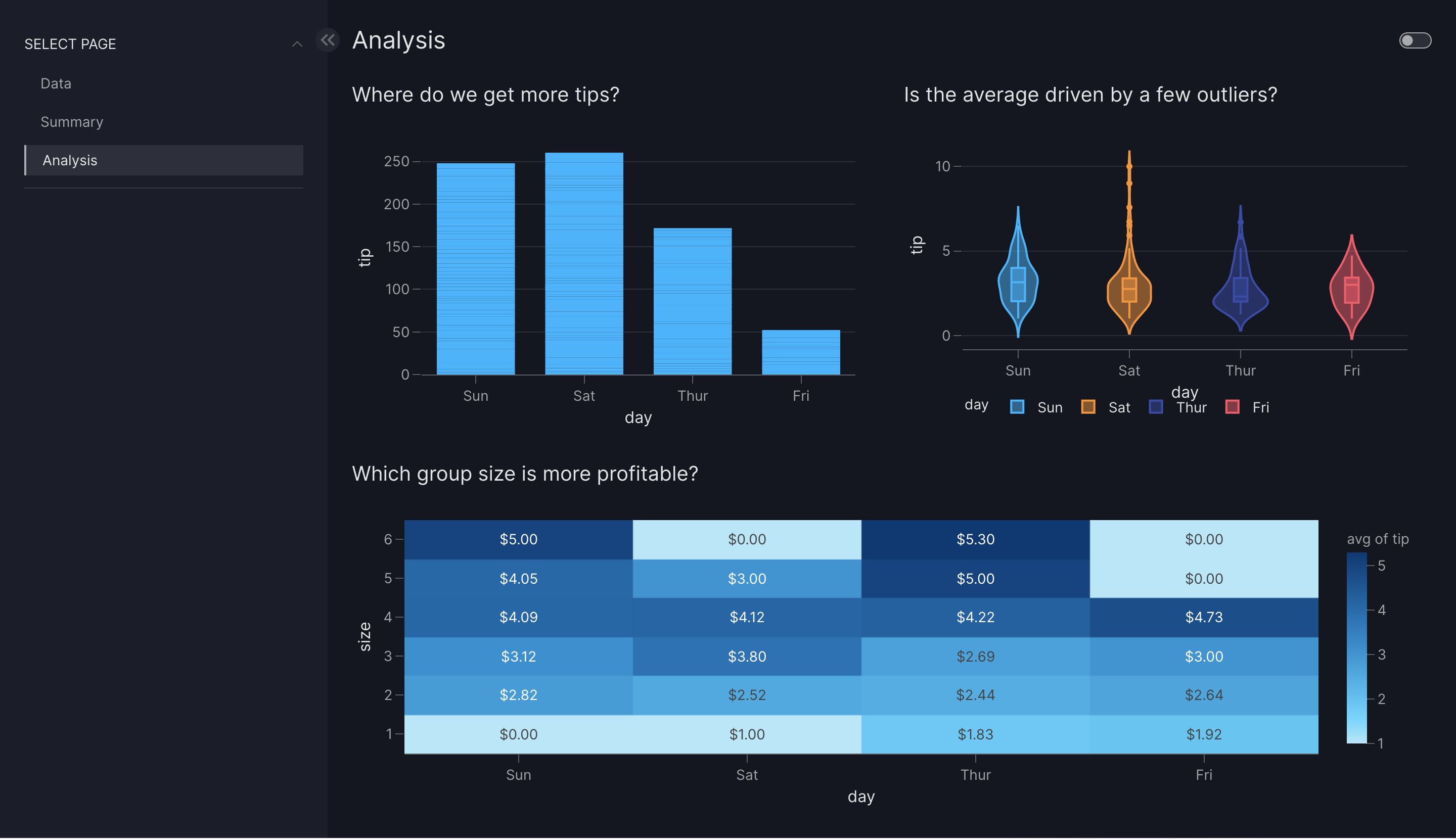 dashboard = vm.Dashboard(pages=[first_page, second_page, third_page], title="Tips Analysis Dashboard")