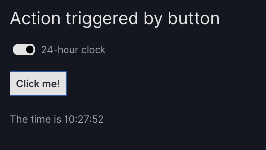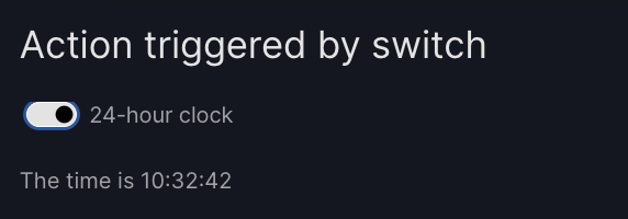 use_24_hour_clockcorresponds to the value of the component withid="clock_switch"(not yet defined). Here we used a keyword argumentuse_24_hour_clock="clock_switch"but, as with normal Python function call, we could instead use a positional argument withcurrent_time_text("clock_switch"). - The returned value "The time is ..." will update the component