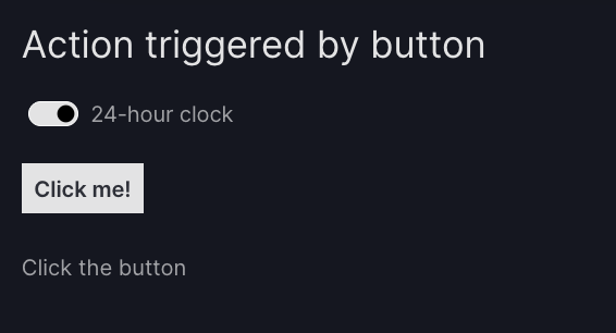For example, let's alter the above example of a switch that toggles between formatting time with the 12- and 24-hour clock. [Switch][vizro.models.Switch] has an argument title that adds a label to the switch. We can update this in an action by including clock_switch.title in the action's outputs.