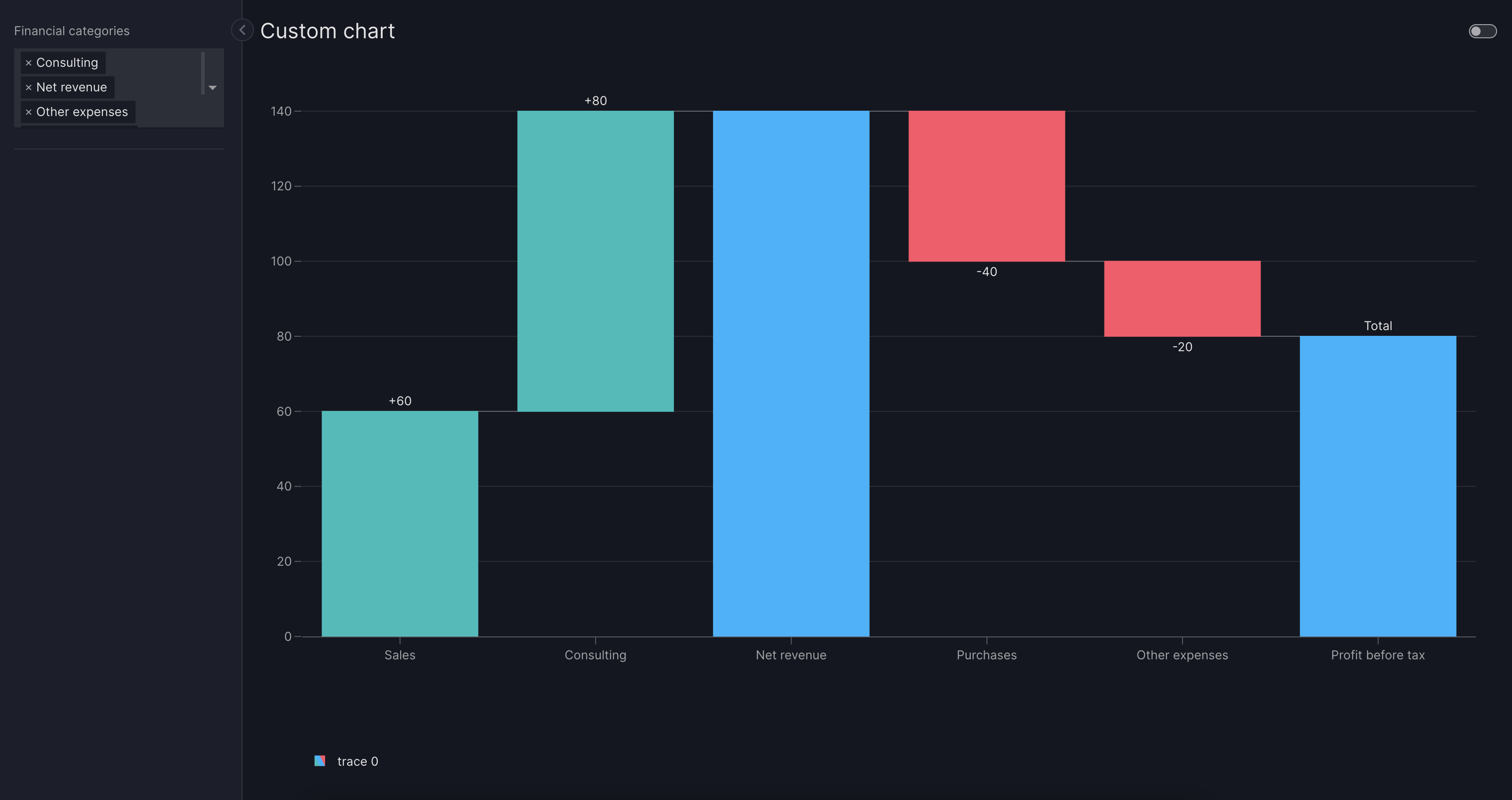 The below examples shows a more involved use-case. We create and style a waterfall chart, and add it alongside a filter to the dashboard. The example is based on a plotly waterfall chart tutorial.