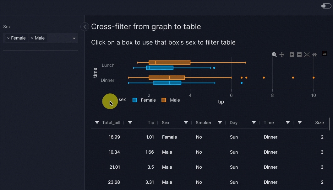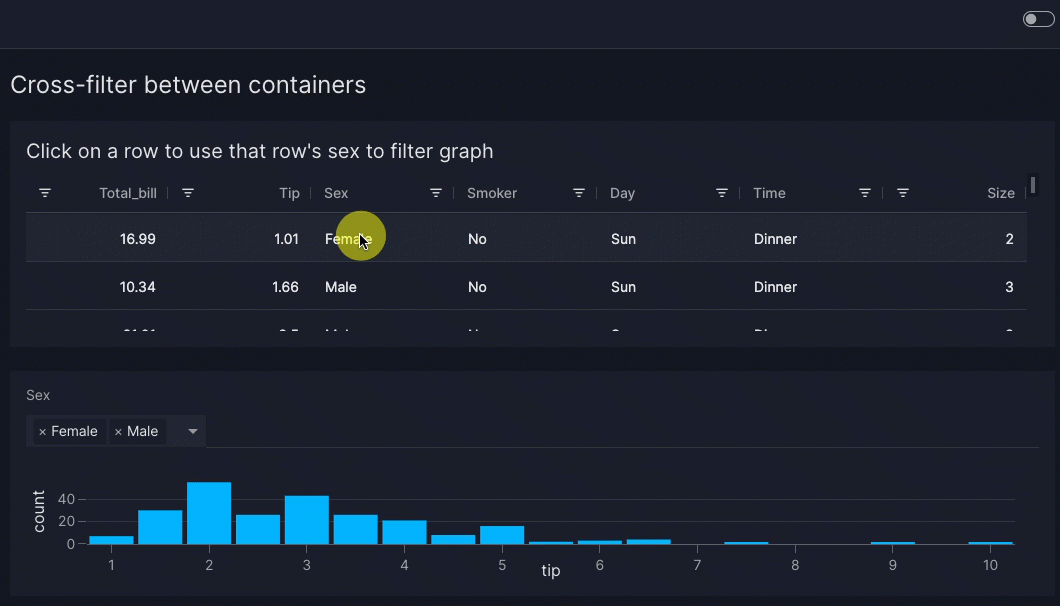 vm.Filter(id="sex_filter")triggers the filter to be re-applied on itstargets=["tips_graph"]so that a filtered graph is shown.