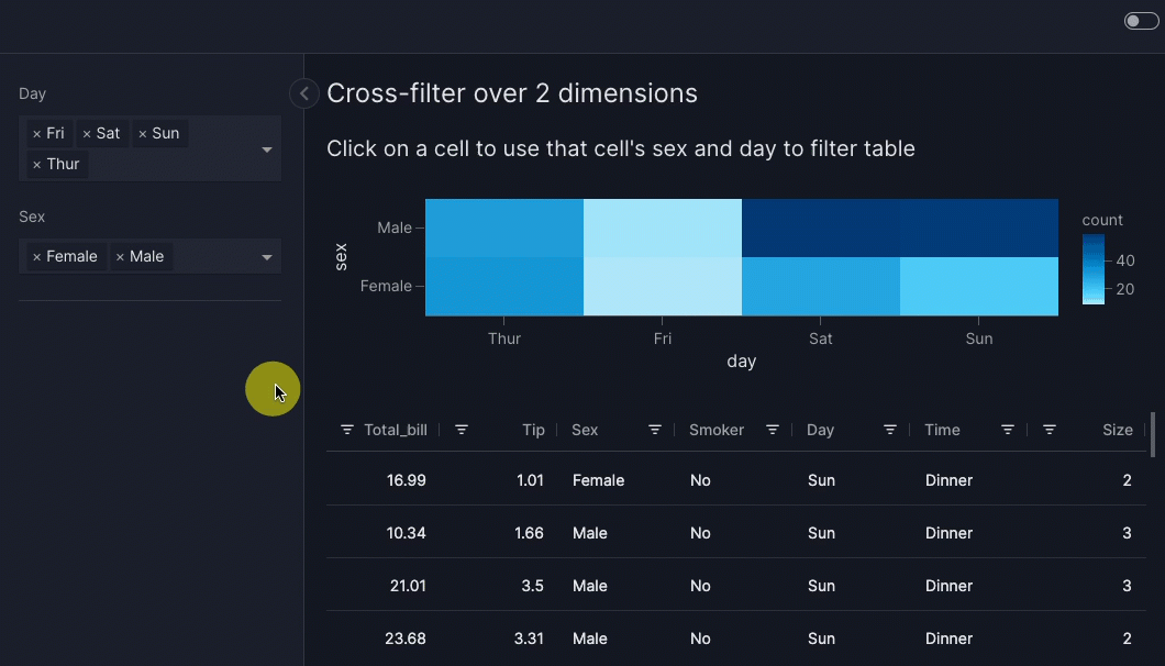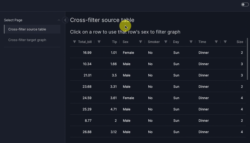 A cross-filter is when the user clicks on one source graph or table to filter one or more target components. In Vizro, a cross-filter operates through an intermediate filter. To configure a cross-filter: