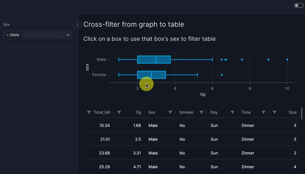 When you click on a row in the table, the graph is cross-filtered to show data only for one sex. The column of the clicked cell does not matter: the value is always taken from the sex column of the clicked row.