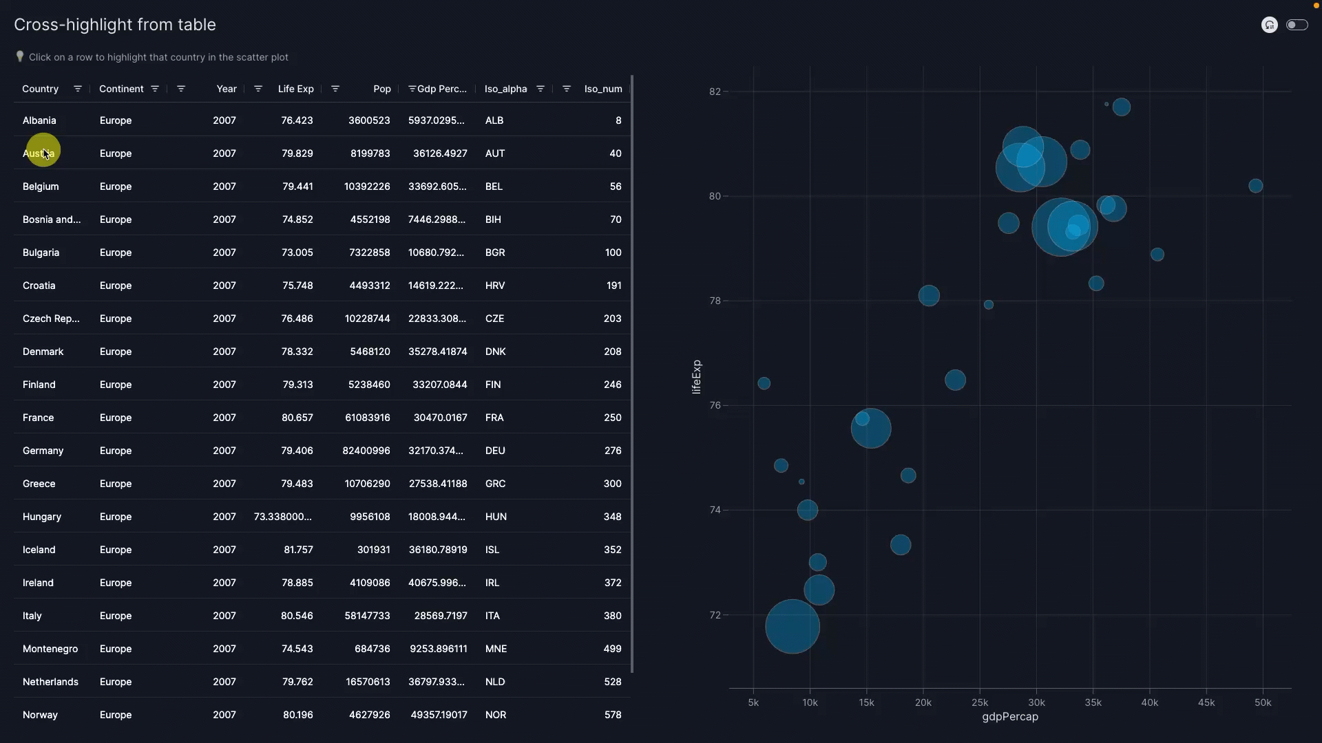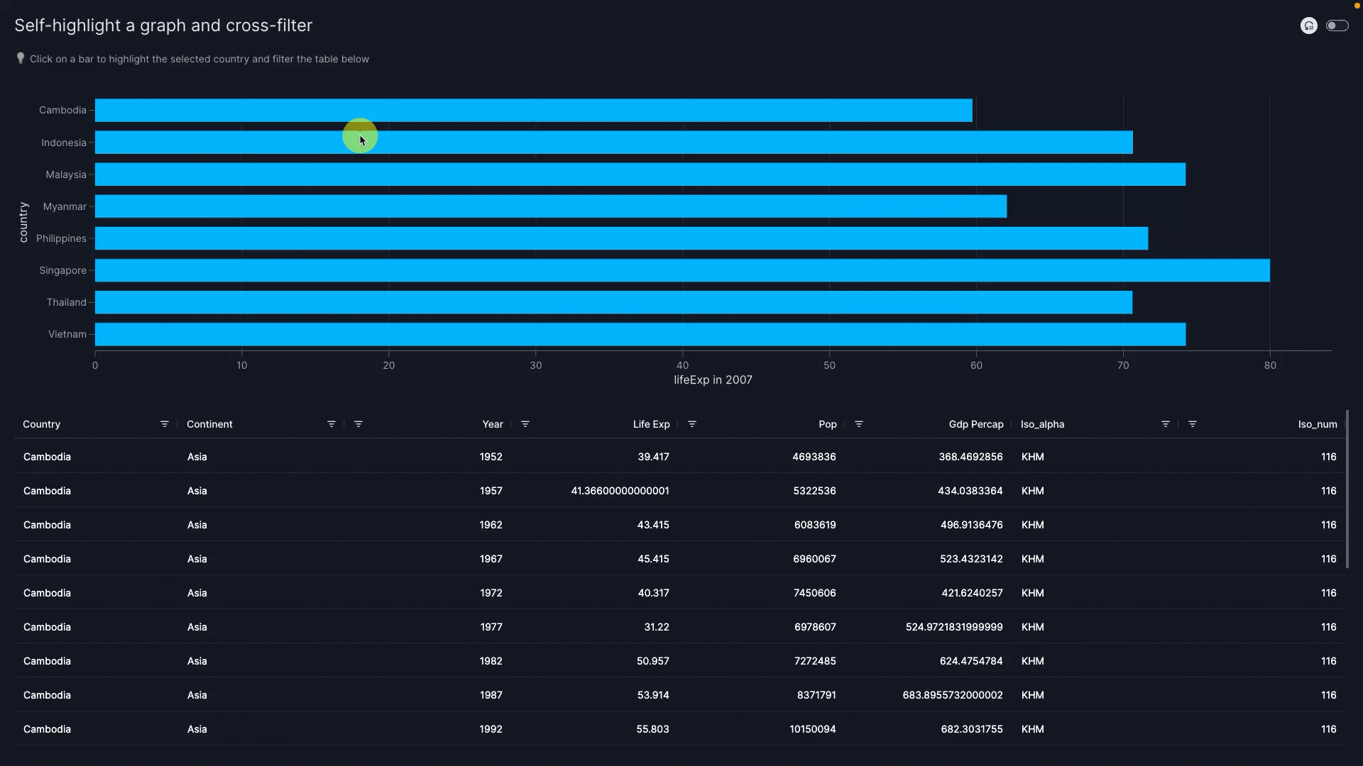 vm.Filter(id="country_filter")triggers the filter on itstargets=["gapminder_table"]so that a filtered table is shown.