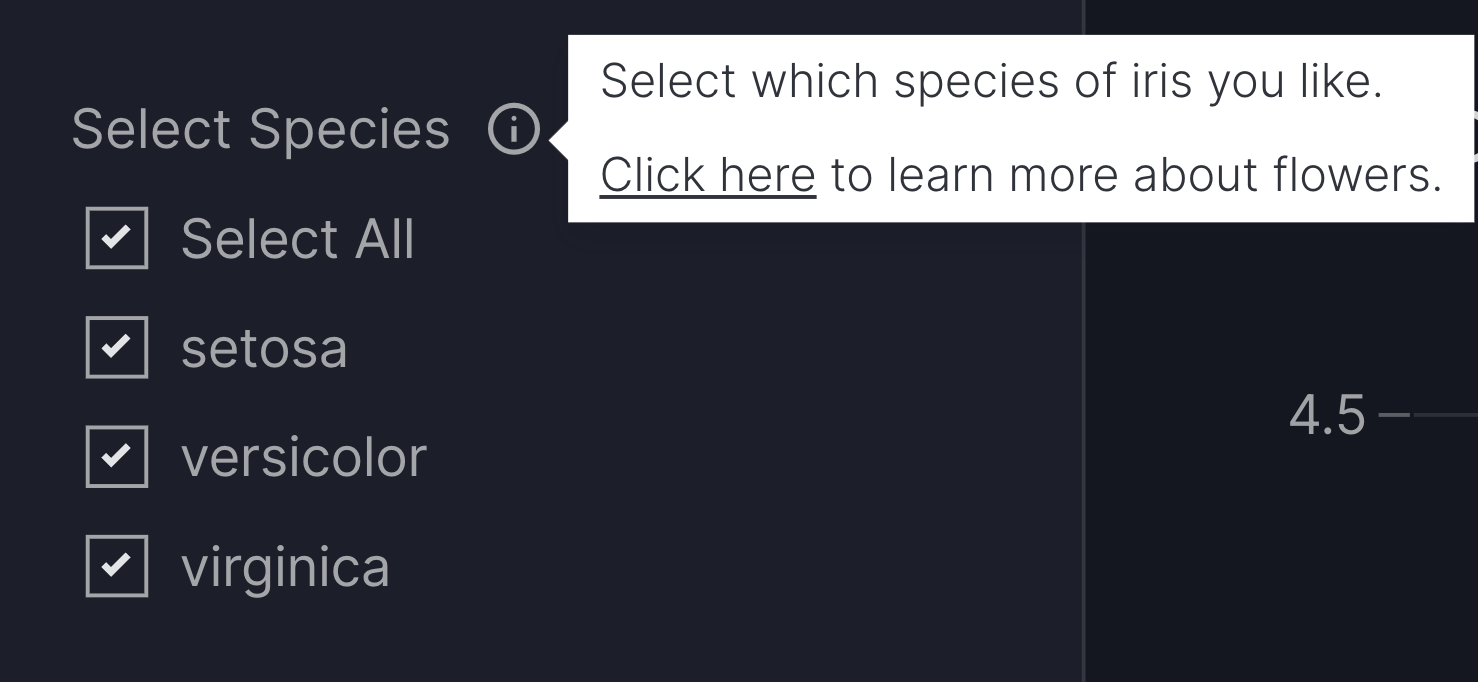 The description argument enables you to add helpful context to your selector by displaying an info icon next to its title. Hovering over the icon shows a tooltip with your provided text.