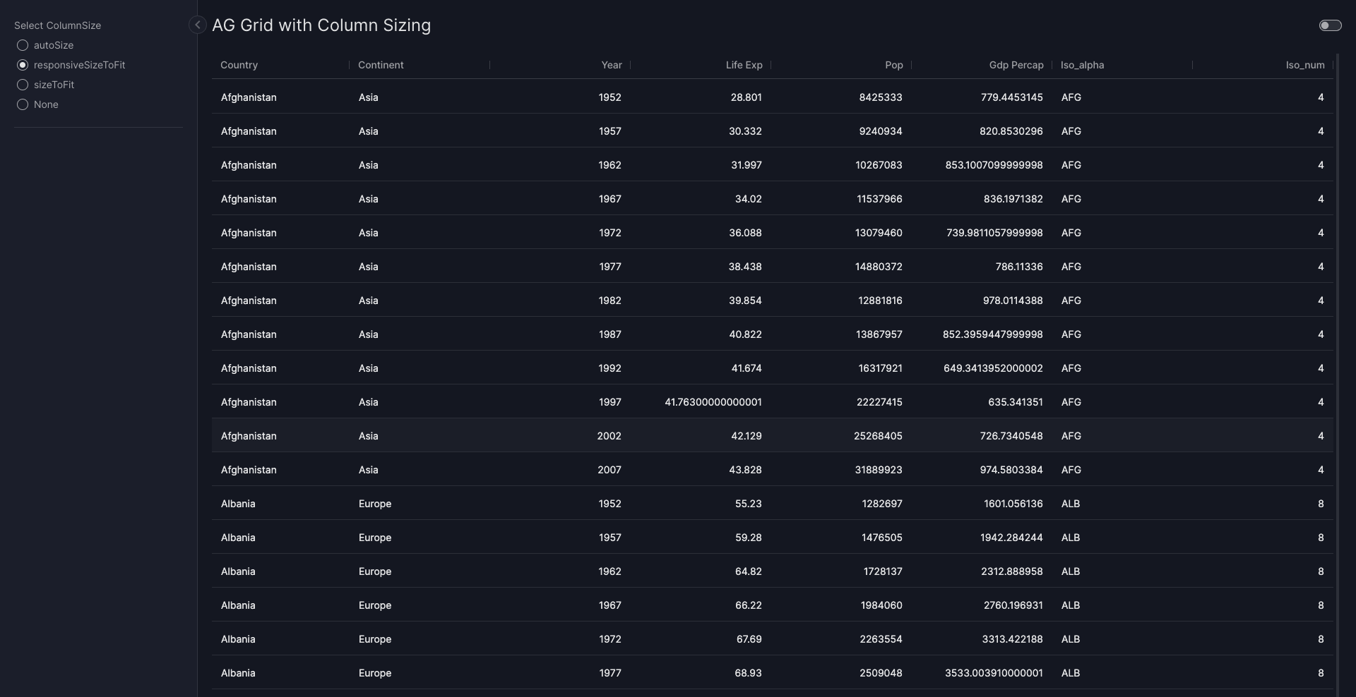 The [AgGrid][vizro.models.AgGrid] provides automatic column sizing options through the columnSize property. This feature allows you to control how columns are sized within the grid to optimize the display of your data.