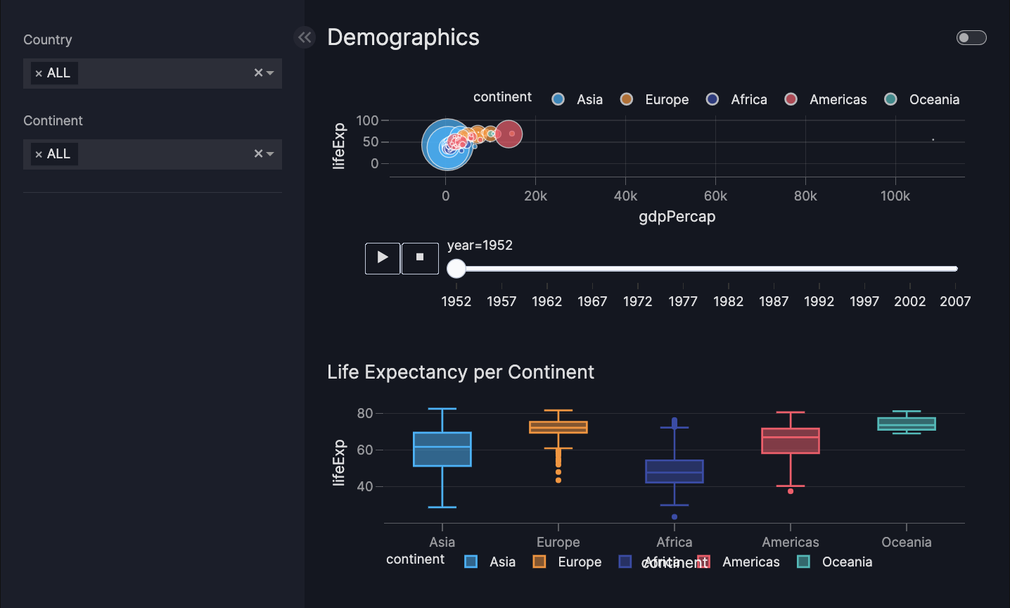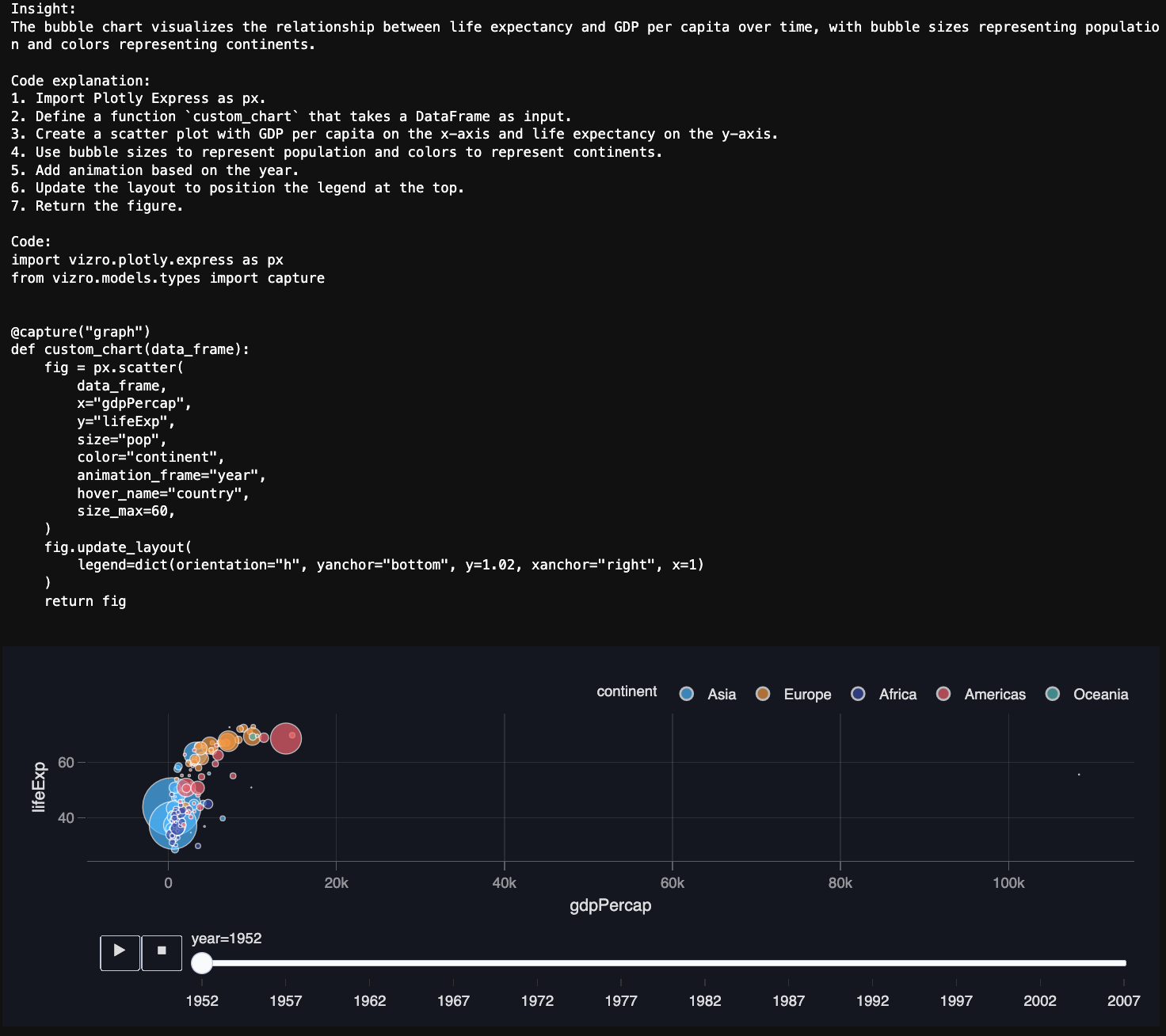 @capture("graph") def custom_chart(data_frame): fig = px.scatter( data_frame, x="gdpPercap", y="lifeExp", size="pop", color="continent", animation_frame="year", hover_name="country", size_max=60, ) fig.update_layout( legend=dict(orientation="h", yanchor="bottom", y=1.02, xanchor="right", x=1) ) return fig