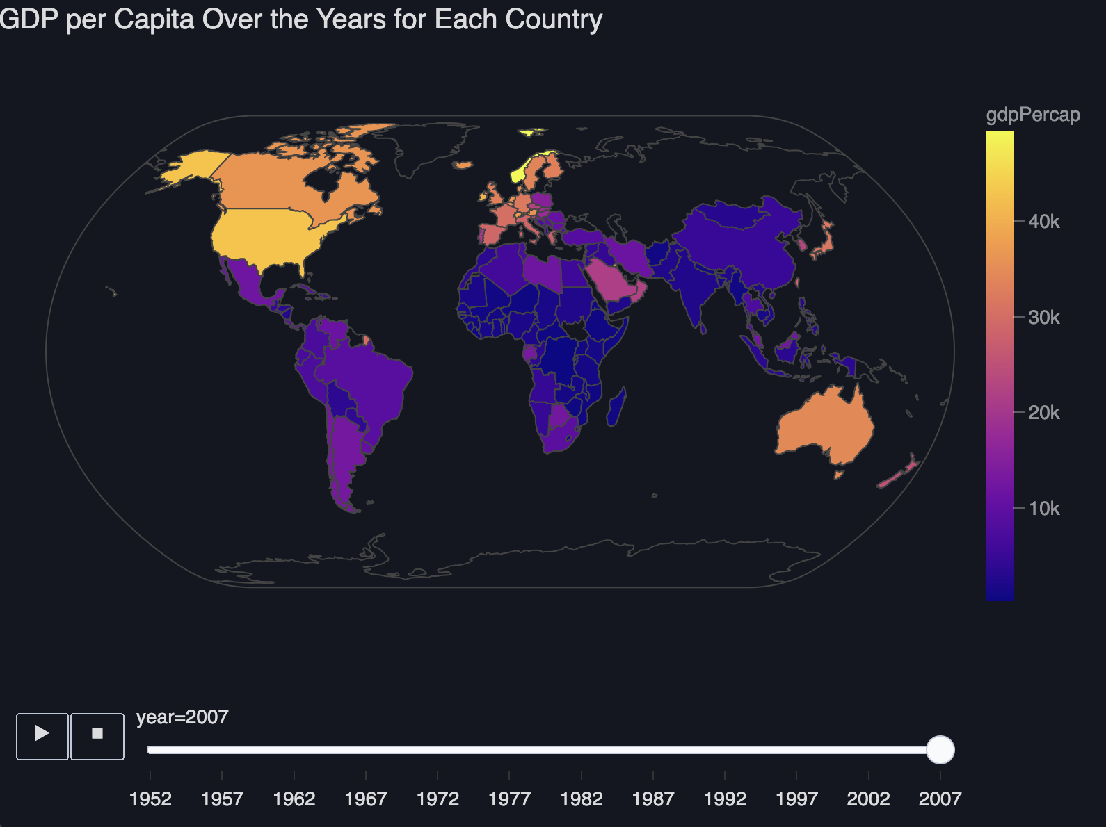 """Visualize GDP per capita over the years for each country using animated map chart.
