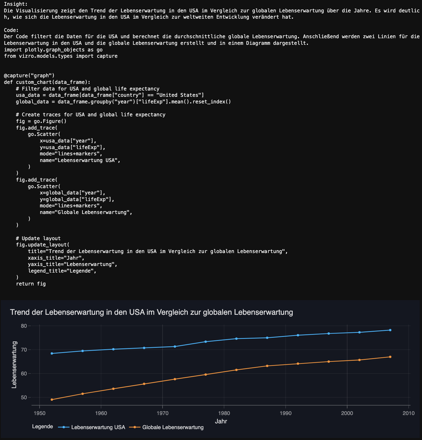 result = vizro_ai.plot(df, "Visualiere den Trend von der Lebenserwartung in USA über die Jahre im Vergleich zur Veränderung der weltweiten Lebenserwartung über die Jahre und kreiere eine deutsche Visualisierung", return_elements=True)